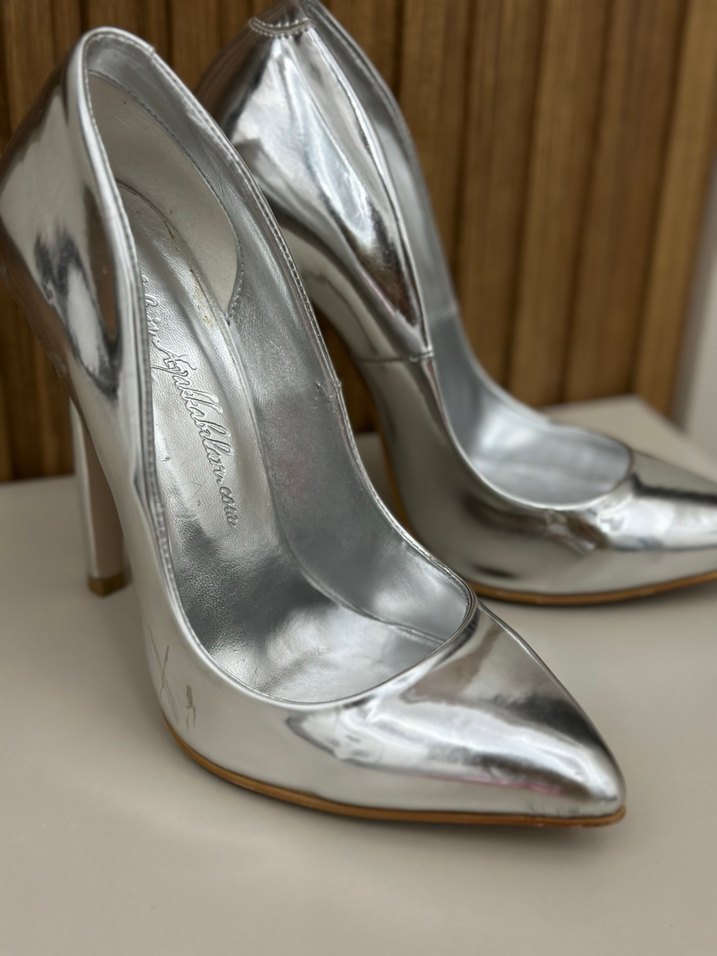 Ofis kullanımı için parlak metalik stiletto topuklu ayakkabılar. Düz ve modern tasarımı klasik zarafetle buluşturur.