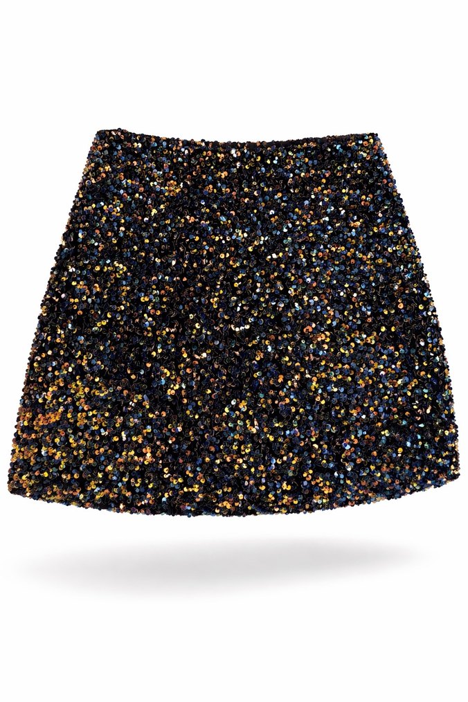 Bu dar kesim mini etek, sentetik kumaştan yapılmış ve çok renkli parlak bir yüzeye sahip. Tie-dye desenli, partiler için uygun, göz alıcı ve yenilikçi tarzda. Arkasında fermuarlı