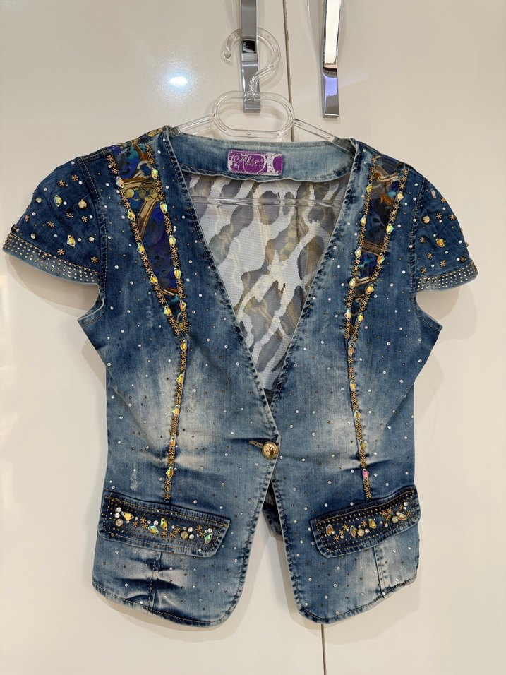 Kadınlar için kısa mini kot ceket, dar kesim, yakalı ve kısa kolludur. Parlak mavi renkli, işlemeli ve payetli desenlerle sokak tarzına uygundur. ✨