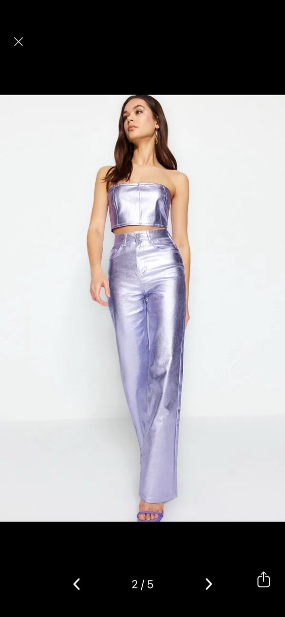 Kadın Parlak Mor Düz Paça Denim takım