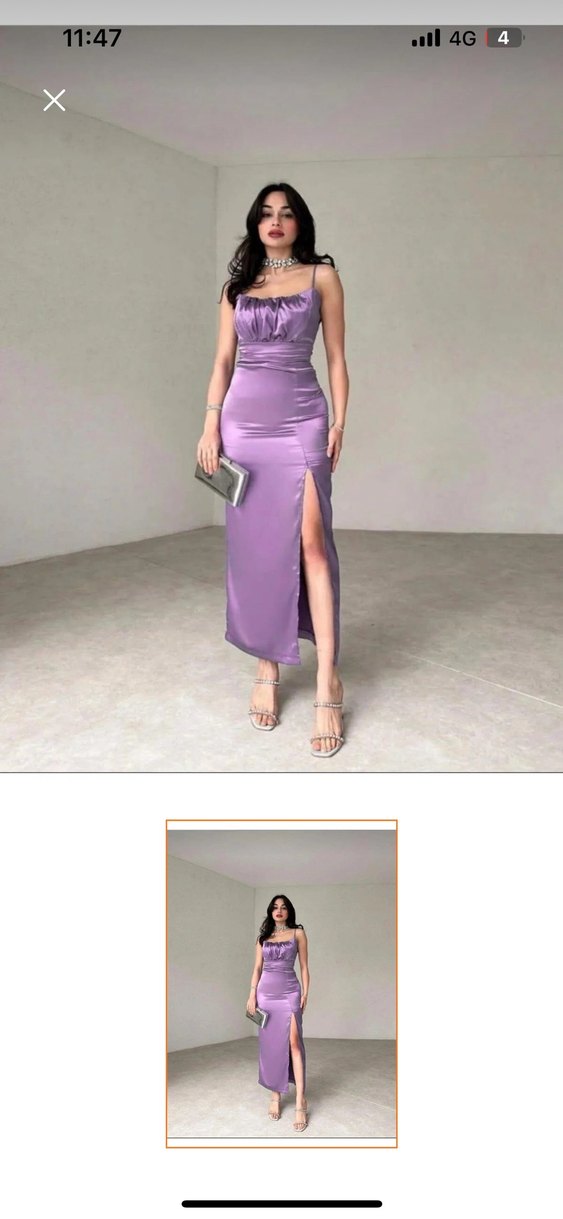 Parlak mor uzun saten elbise, straplez yakalı ve drapeli detaylıdır. İnce askılı ve yırtmaçlı, düğünler için uygundur.