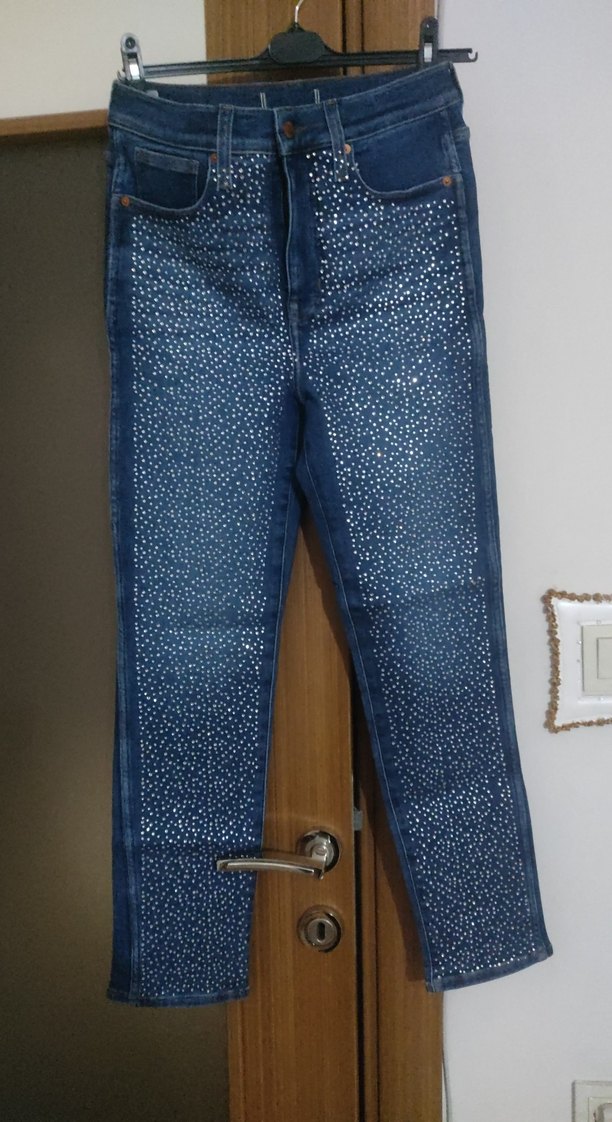 Parlak payetlerle süslenmiş, bağlama desenli, fitted kesim mavi denim pantolon, günlük şık kullanım için uygundur.