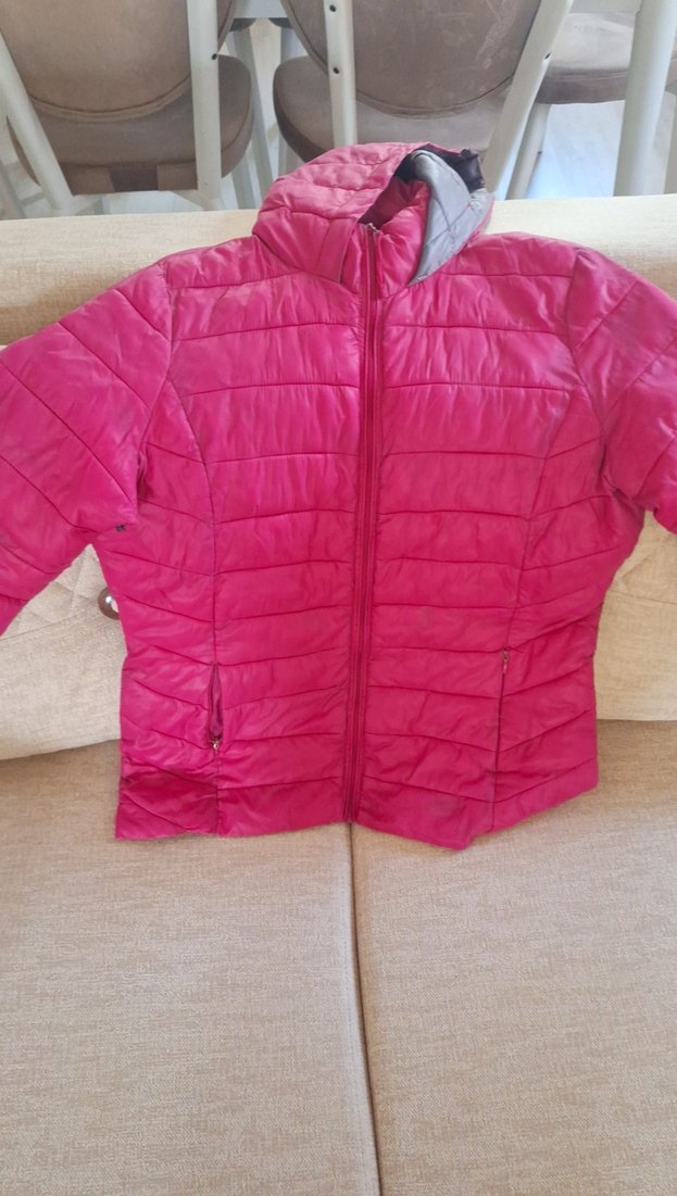 Parlak pembe renkte, fermuarlı ve uzun kollu, sentetik kumaştan yapılmış, normal midi uzunlukta ve kesimli kadın montu. Sokak stili için uygun bir parça.