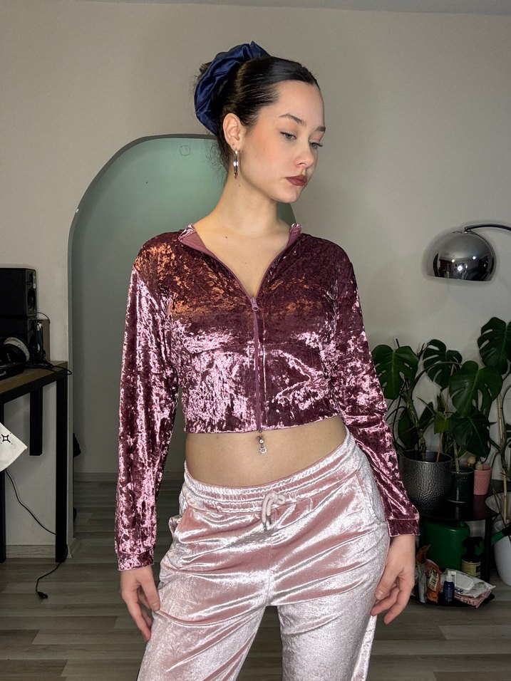 Kadınlar için parlak pembe kadife kumaştan, fermuarlı ve uzun kollu, dar kesim eşofman takımı. Trendy ve parti için uygun. ✨ #y2k #parishilton TAKIMDIR