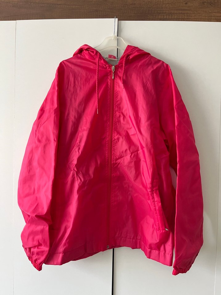 Kadınlar için parlak pembe, kapüşonlu, fermuarlı sentetik kumaştan yapılmış yağmurluk. Uzun kollu, bol kesim ve midi boyda, dış mekan kullanımı için uygundur. ️