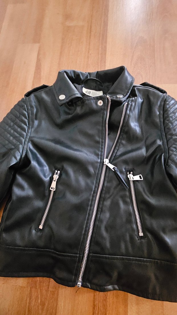 Parlak siyah deri biker ceket, fermuarlı cepler, kesik yaka ve dar kesim askılı kollara sahip. Günlük kullanım için grunge punk tarzı.
