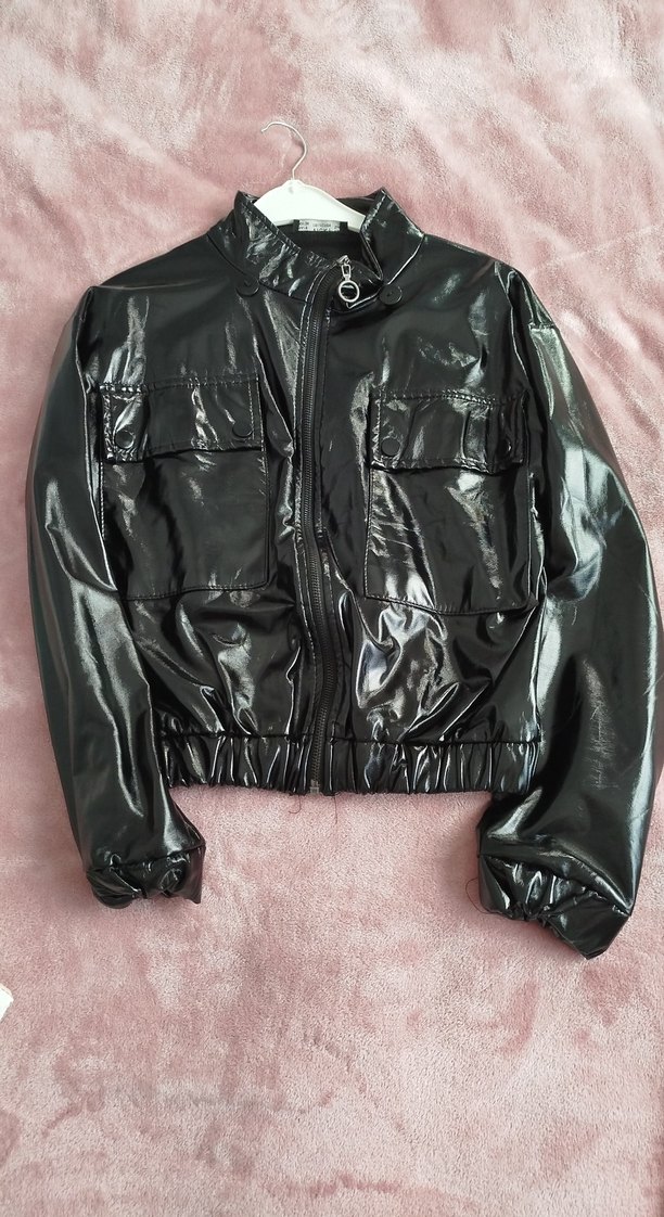 Parlak siyah deri, yüksek yakalı, midi uzunlukta ve dar kesim kadın ceketi. Askılı kolları ve ön cep detaylarıyla rock punk tarzına uygun.