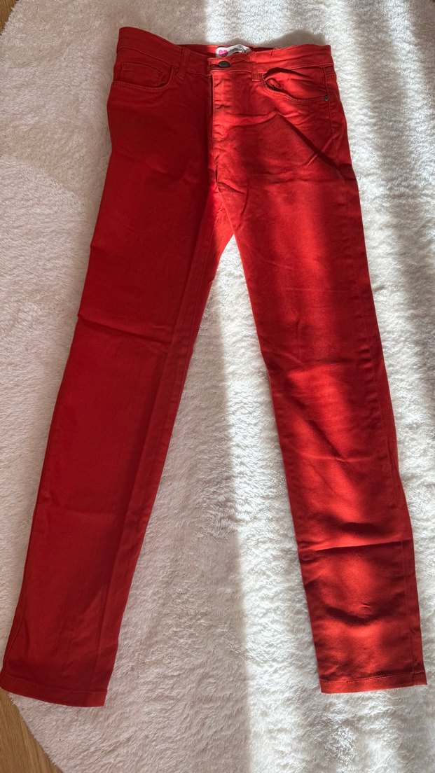 Kadınlara özel, parlak turuncu renkte, fermuarlı detaylı, midi boy kumaş pantolon. Minimalist ve desen içermeyen, günlük kullanım için uygundur. ✨