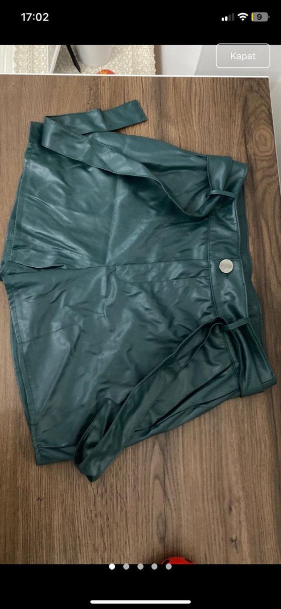 Beltli, bol kesim, parlak yeşil deri mini şort, sokak stili ve günlük kullanıma uygun.