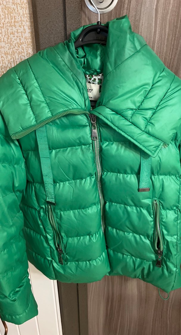 Kadınlar için parlak yeşil sentetik kumaştan, fermuarlı ve strappy kollu, normal uzunlukta, sokak stiline uygun kış montu.