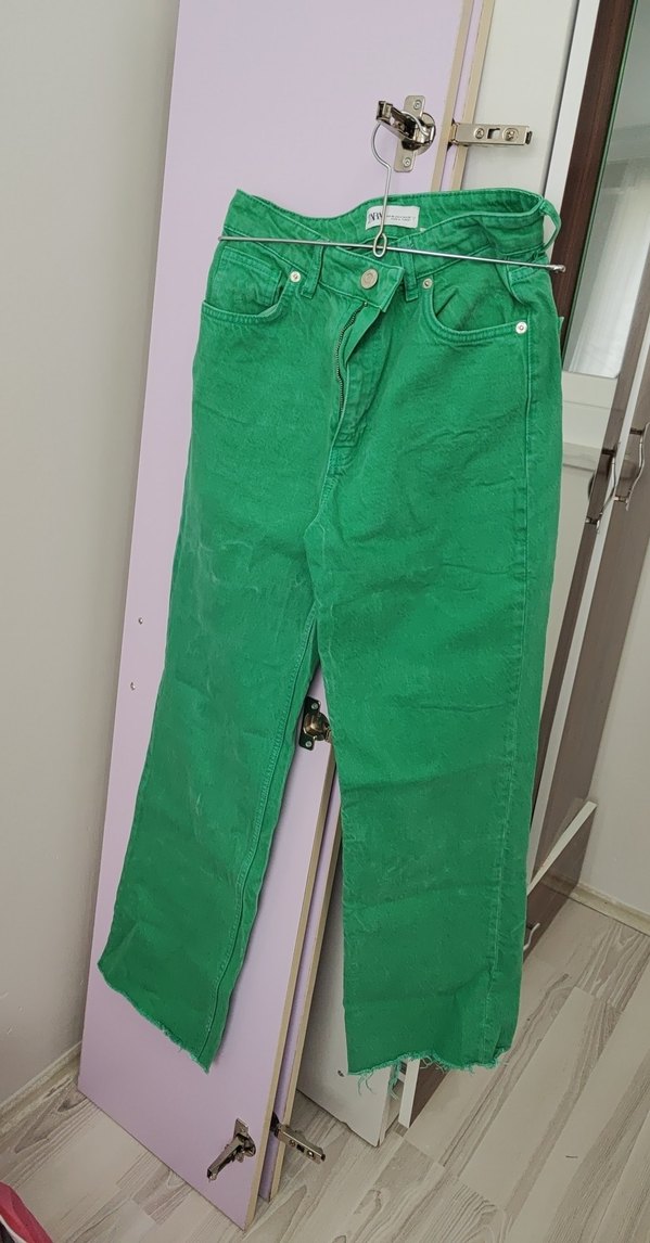Kadınlar için yeşil renkte, normal boy midi pantolon. Rahat kesim ve sentetik kumaştan, günlük sokak stili için uygundur.