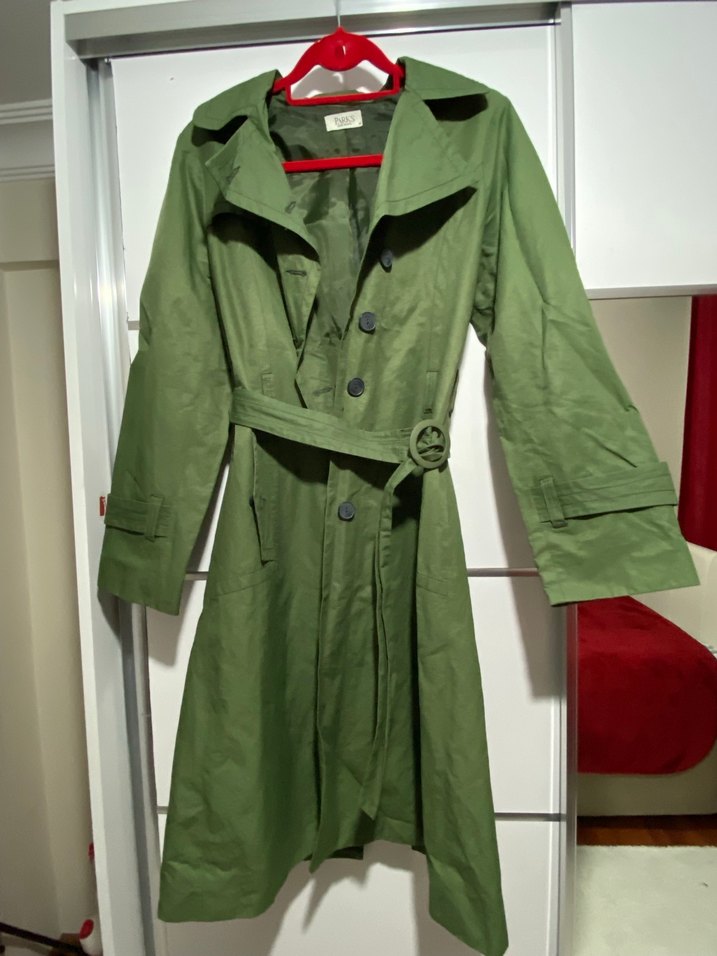 Kadınlar için parlak yeşil renkli, kemerli, normal boy midi trençkot. Uzun kollu, geniş kesim ve klasik yakalı tasarım.