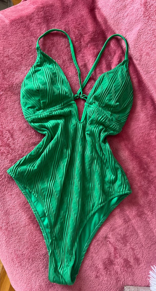 Bu kadın mayo, parlak yeşil pilili kumaş ve strappy detaylarıyla vücuda oturan, bohem ve avangart bir stil sunar.