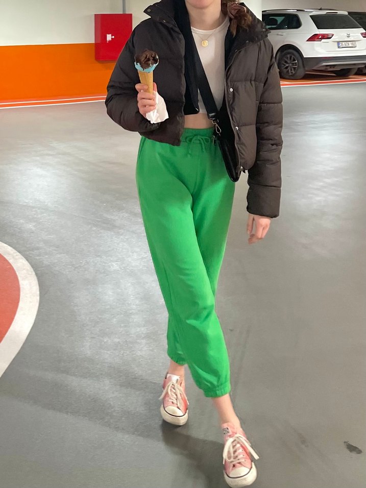 Kadınlar için parlak yeşil renkte, rahat kesim ve midi boyda sweatpant. Yumuşak ve sıcak kumaştan üretilmiştir, spor ve sokak stiline uygundur. ♀️