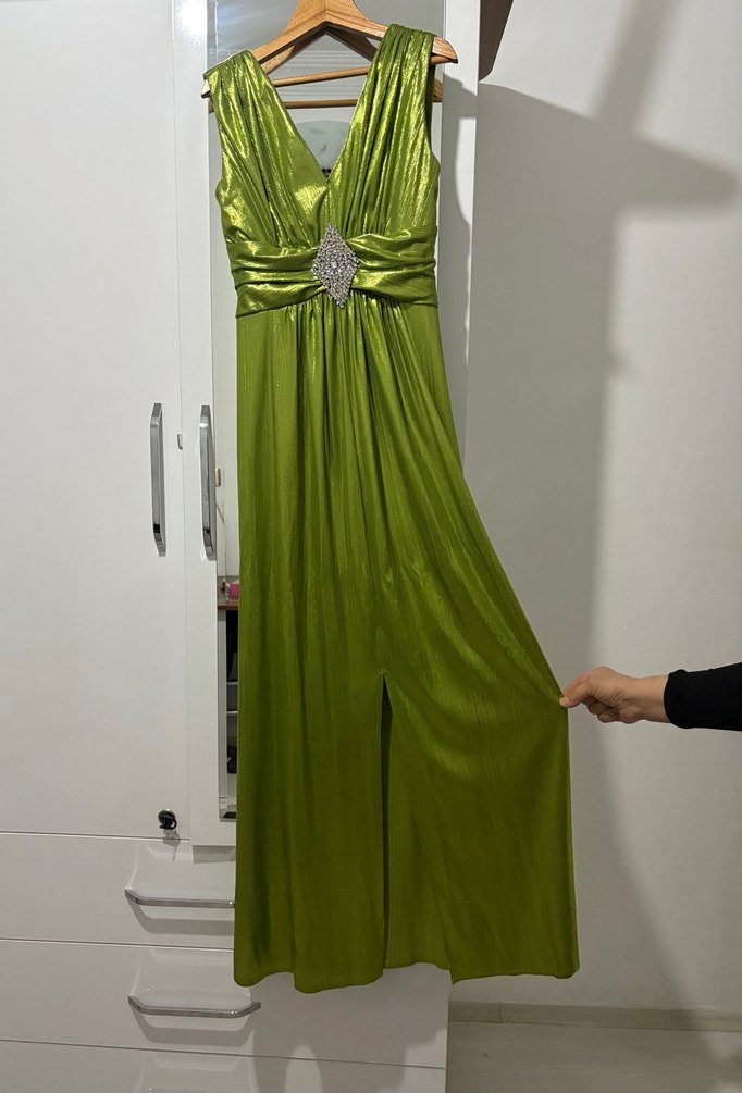 Kadın Parlak Yeşil Uzun Drapeli Abiye Elbise
