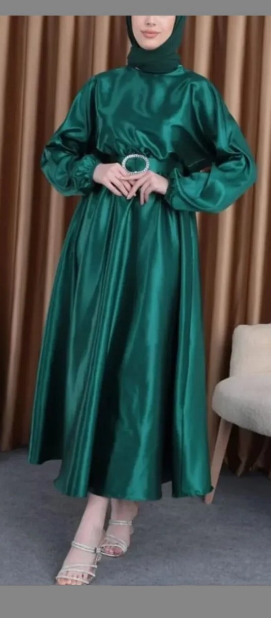Parlak yeşil renkte, uzun kollu ve salaş kesim abiye elbise. Kayık yaka ve drapeli detaylara sahip, tesettür stiline uygun klasik tasarım 38 beden