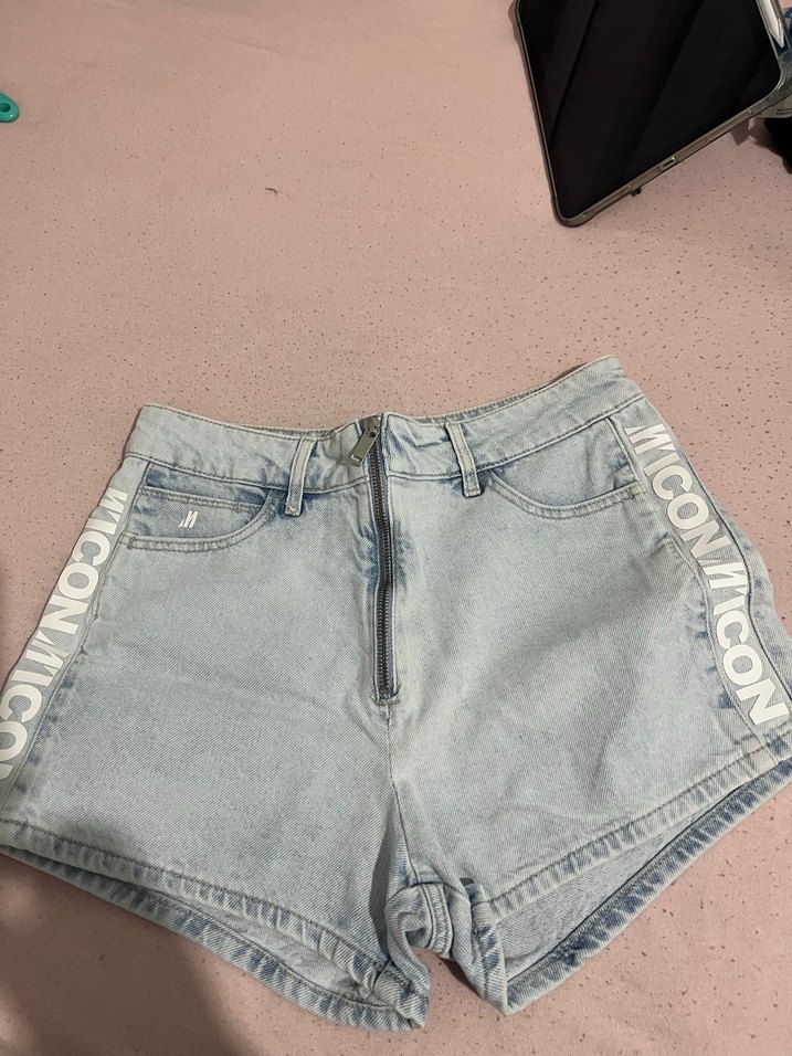 Kadınlar için pastel mavi tonlarında, bol kesim mini denim şort. Önünde fermuar ve yanlarında beyaz yazı detayları bulunur, günlük rahat kullanım için uygundur. Orijinaldir.