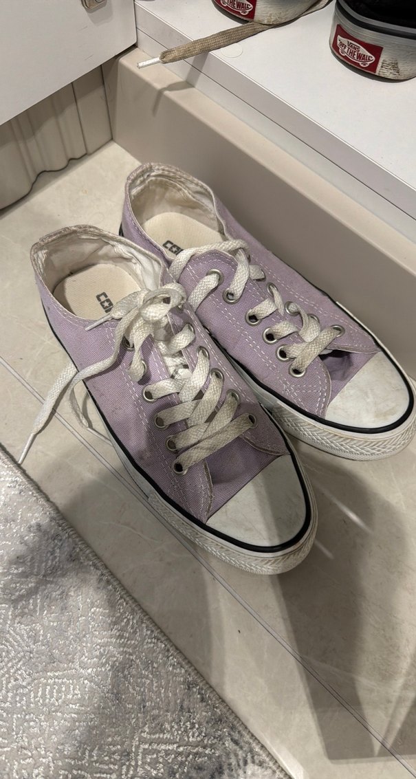 Pastel mor renkli, bağcıklı ve batik desenli spor ayakkabılar, günlük kullanım için rahat ve şık bir seçenek sunar.