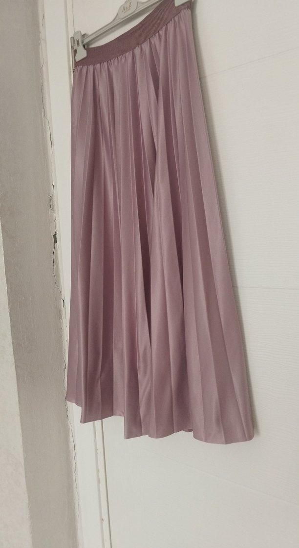 Kadınlar için pastel bej tonunda, pilili ve bol kesim uzun etek. Yumuşak sentetik kumaştan, minimalist ve çağdaş stil, düğün gibi özel günlere uygun.