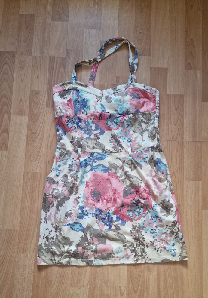 Kadınlar için pastel çok renkli çiçek desenli kısa elbise, ayarlanabilir askılı ve vücuda oturan kesime sahip.