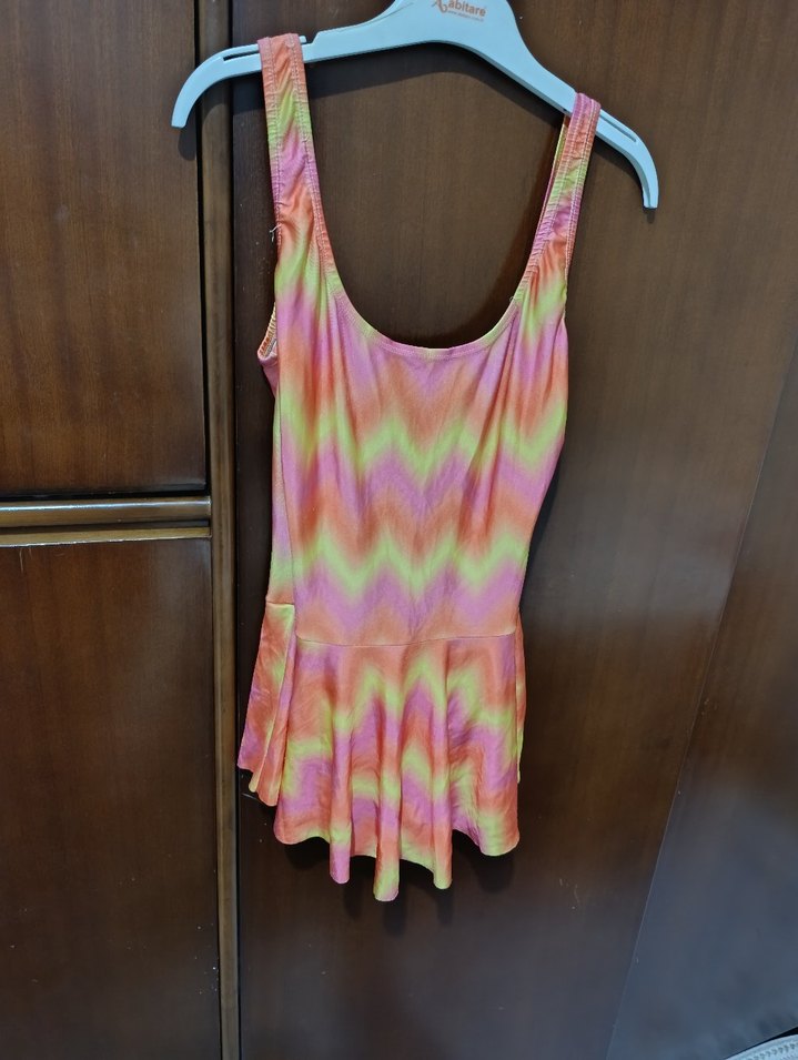 Kadınlar için pastel çok renkli tie-dye desenli, kolsuz ve vücuda oturan mayo. Mini etek kısmında fırfır detayı bulunur, bohem ve streetwear tarzını birleştirir.