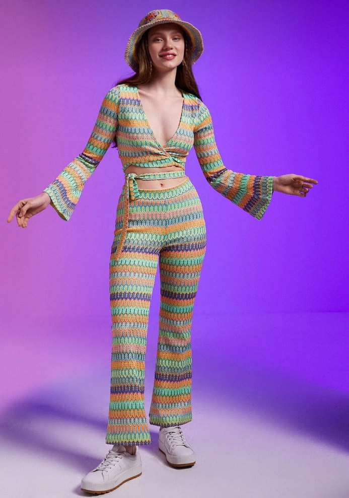 Kadınlar için pastel çok renkli batik desenli, örgü kumaştan yapılmış, bohem tarzda, parti için uygun salaş kesim pantolon takımı etiketi yok ama hiç giymedim xs-s bedenler tercih edebilir esneyen bir kumaşı var m için de uygun olduğunu düşünüyorum