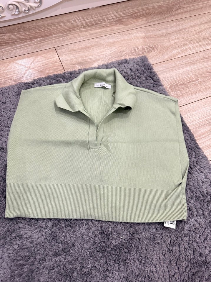Kadınlar için örgü yaka, bol kesim ve uzun kollu kısa uzunlukta, pastel renkte sade tasarımlı, yumuşak ve sıcak kumaştan yapılmış kazak.
