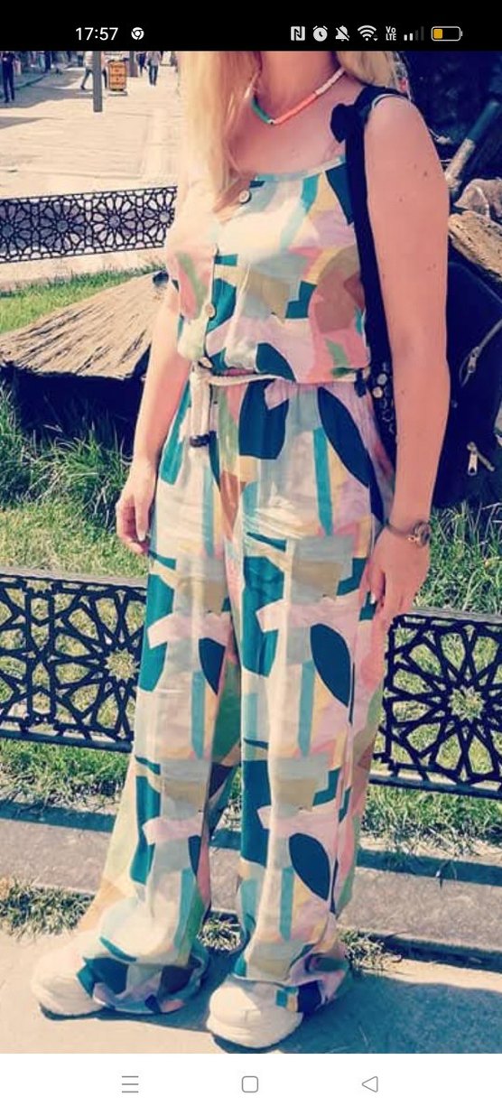 Kadınlar için bol kesim, straplez uzun tulum. Pastel tie-dye desenli, yumuşak sentetik kumaştan, drapeli detaylı ve askılı kollu, dış mekan kullanımı için uygun.