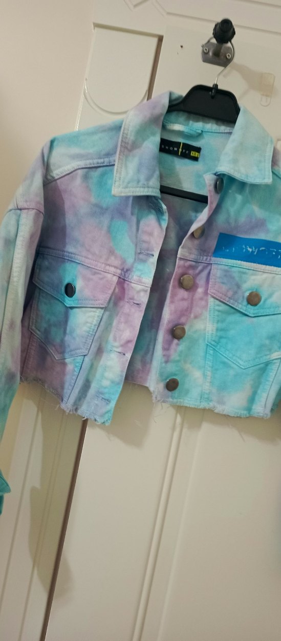 Kadınlar için pastel renkli tie-dye desenli, düğmeli mini denim ceket. Geniş kesim, çentikli yaka ve uzun kolludur. Street style için uygundur.