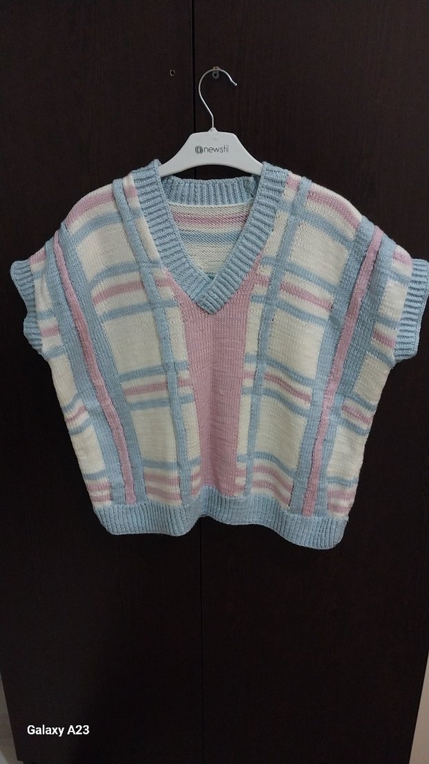 Pastel renklerde, V yaka ve kısa kesim, rahat kalıplı kadın triko süveter. Bohem tarzıyla günlük sokak modasına uygun, yumuşak örgü kumaşlı kolsuz model. el örgüsü yeni gibidir hediye geldi kullanilmiyor