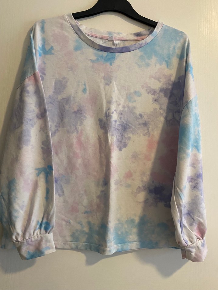 Kadın sweatshirt, pastel renklerde tie-dye desenli, uzun kollu ve yuvarlak yakalıdır. Pamuklu, rahat kesim ve normal boydadır, günlük sokak stili için uygundur.