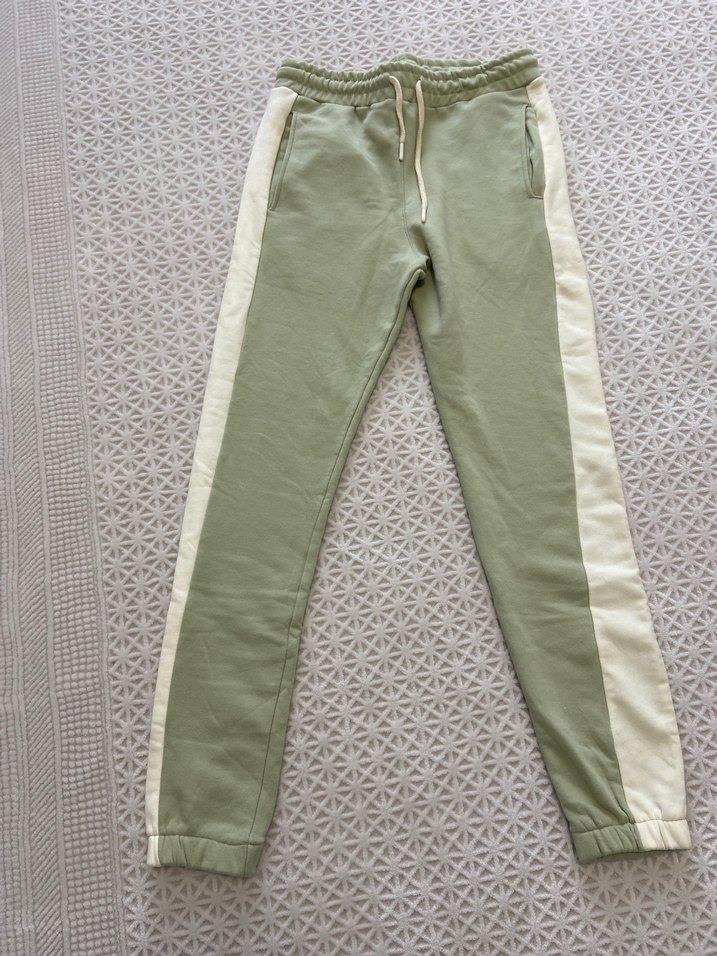 Kadınlar için pastel yeşil, beyaz yan şeritli, bağcıklı ve bol kesim eşofman altı. Günlük kullanıma uygundur.