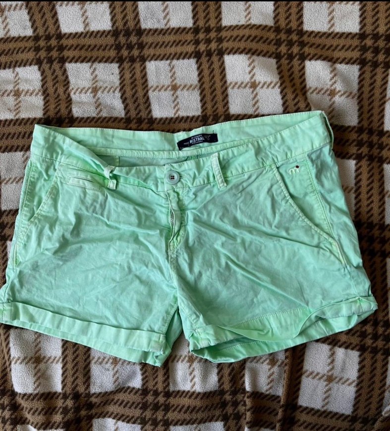 Pamuklu, rahat kesim ve pastel yeşil renkte olan bu mini şort, plajda gündelik şıklık için uygundur.