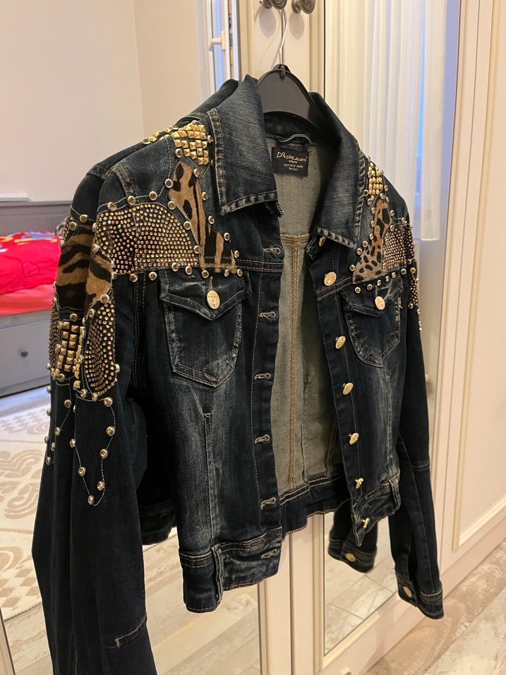 Bu dar kesim koyu denim ceket, uzun kollu ve yaka detaylıdır. Altın payet ve çivili desenlerle sokak stili sunar. Midi boyda, trend günlük kullanım için uygundur. ✨ Ürün Milanodan alındı