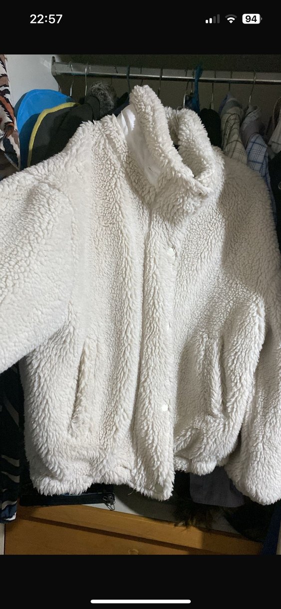 , bol kesim peluş mont. Yumuşak kumaştan, yüksek yakalı ve uzun kollu, kürk detaylı, midi boyda sade tasarım. Az giyildi