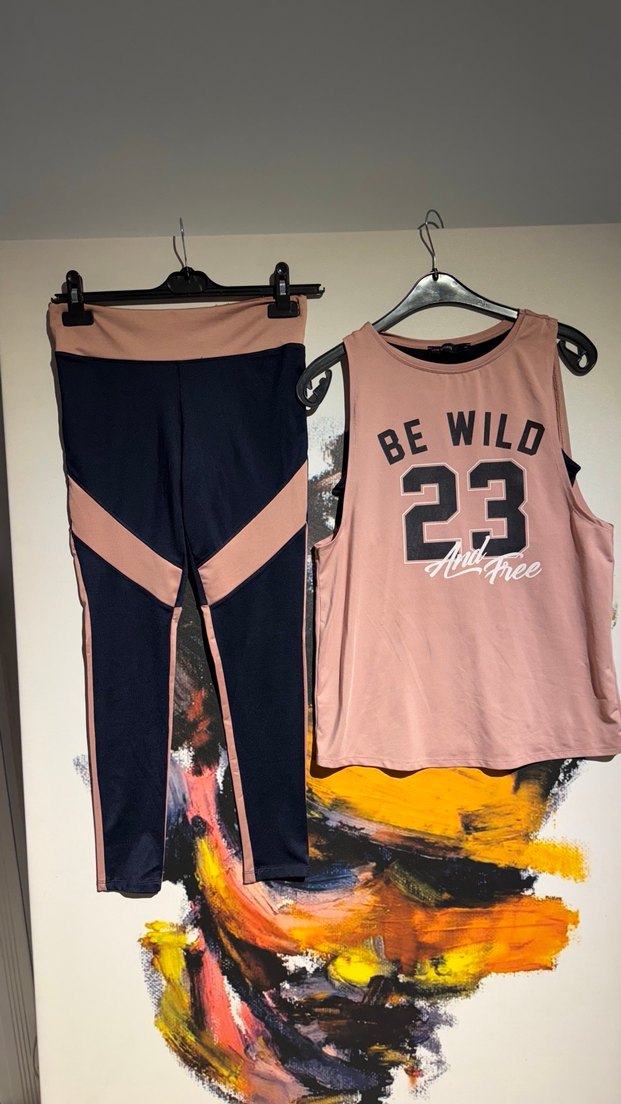Kolsuz pembe üst, "BE WILD 23" baskılı, koyu taytlarla uyumlu. Rahat kesim ve kemer detayıyla trend spor tarzı sağlar.