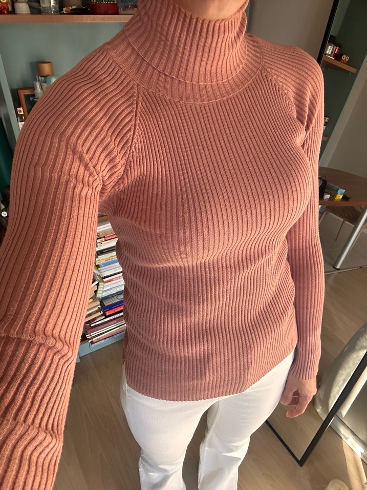 pembe - bej renkli, balıkçı yaka ve uzun kollu, vücuda oturan triko kazak. Günlük kullanıma uygun rahat ve sade stil sunar. Çok az kullanıldı boğazlı kullanmayı sevmediğimi farkettim