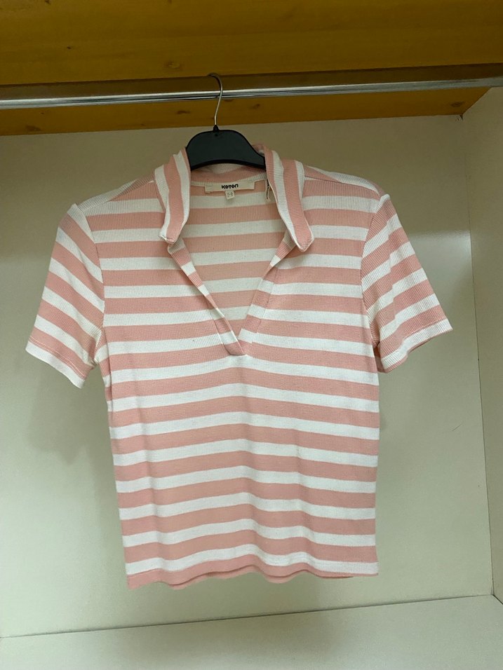 Kısa kollu, yakalı ve düğmeli ön kısmı olan, pembe-beyaz çizgili, sentetik kumaştan yapılmış, dar kesim kadın polo tişört. Sokak stili için uygun.