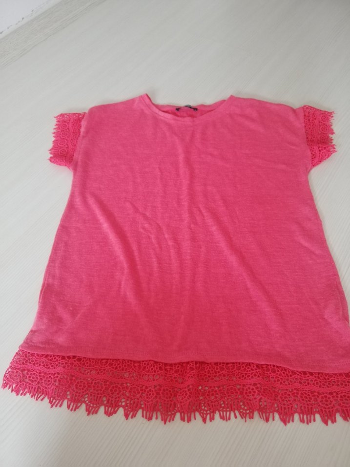 Canlı pembe renkli, kısa kollu, yuvarlak yakalı ve dantelli uç detaylı bol kesim kadın tişörtü.