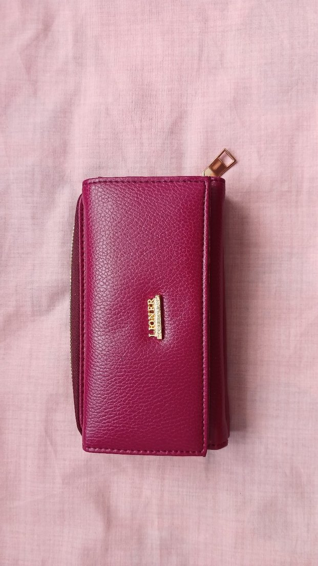 Pembe deri kadın cüzdanı, fermuarlı kapama ve parlak yüzeye sahiptir. Minimalist tasarımı, cesur ve modern klasik tarzı günlük kullanıma uygundur.