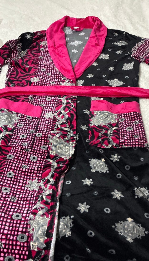Kadınlar için uzun, fit kesim bohem tarzda, askılı kollu pembe desenli bornoz. Kontrastlı yaka ve kemerle rahat bir görünüm sunar.