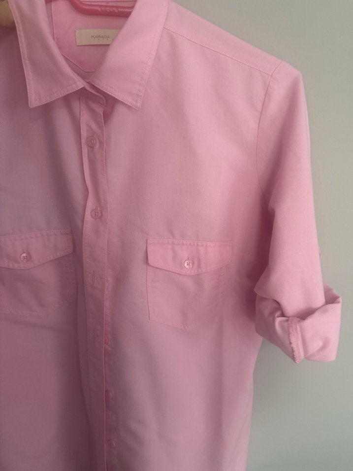 Kadınlar için pastel pembe renkte, düğmeli, yakalı ve uzun kollu gömlek. Pamuk kumaştan, normal boyda ve regular fit kesime sahiptir. Minimalist tarzda günlük kullanıma uygundur.