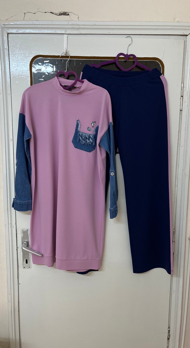 Kadınlar için bol kesim, düğmeli uzun kollu eşofman takımı. Üst parça pastel pembe, kol ve ceplerde denim detaylı, alt lacivert pantolon yanlarında pembe şerit bulunur. Yumuşak ve rahat kumaştan üretilmiştir.