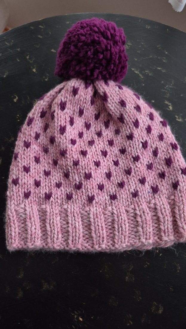Kadınlar için örme, renkli pembe desenli ve üstünde ponponlu, rahat ve sade tarzda bere.