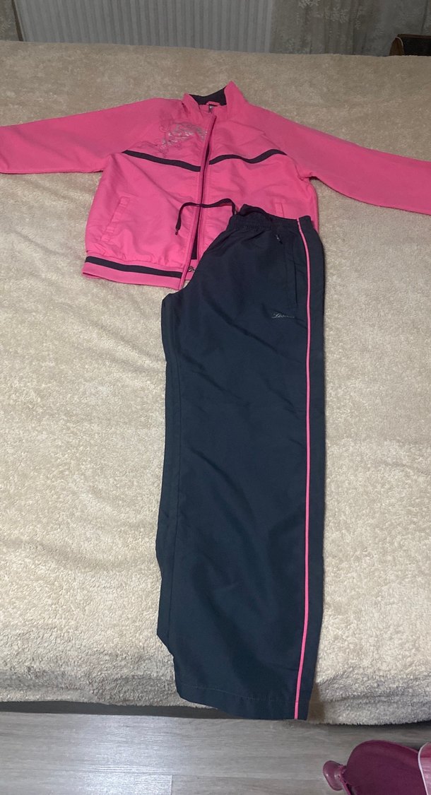 Koyu pembe fermuarlı sweatshirt ve yanları pembe çizgili koyu renk eşofman, uzun kollu ve bisiklet yaka, rahat ve şık kadın takım,az kullanıldı deforme yok