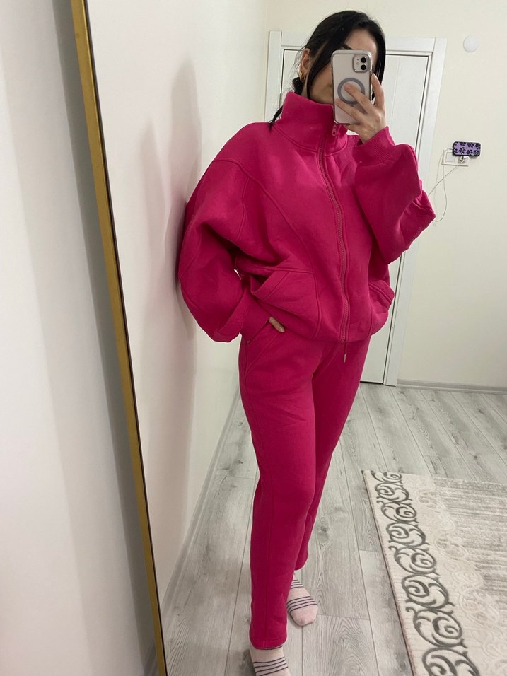 Kadınlar için bol kesim, yüksek yakalı ve fermuarlı eşofman takımı. Yumuşak ve sıcak kumaştan, uzun kollu ve normal boyda, günlük rahat kullanım için ideal. Pastel pembe renkte, trend sokak stili.