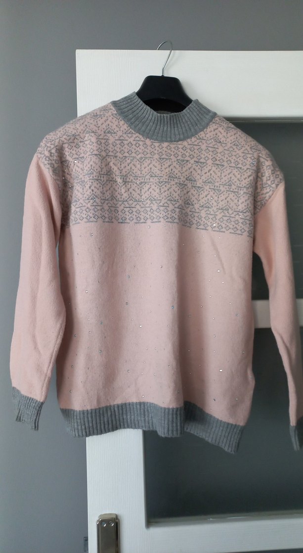 Kadınlar için yuvarlak yaka, uzun kollu, yumuşak triko kazak. Gevşek kesim, pastel pembe renk, üst kısmında gri desen ve ribanalı kenarlar bulunur yün kaşmir karışımı Günlük kullanıma uygundur az kullanılmış bir kazak iade kabul edilmeyecektir