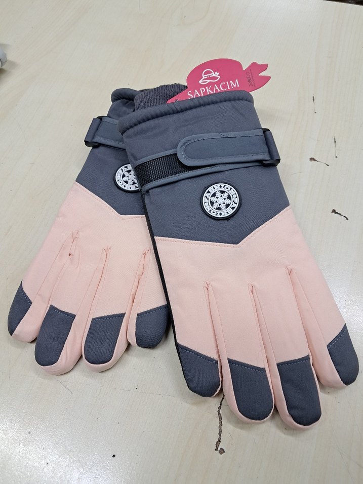 Pembe ve gri renklerde, baskılı detaylı, kayışlı kadın eldiveni. Yumuşak ve sıcak tutan malzeme kullanılmıştır.