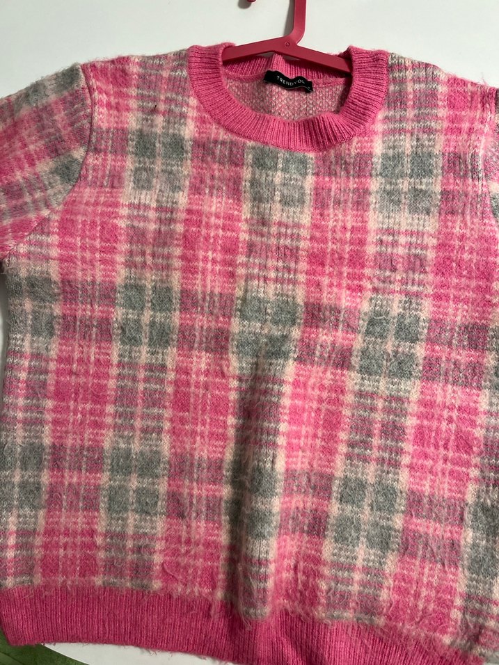 Kadınlar için örgü yün kumaştan, yuvarlak yaka ve uzun kollu kazak. Salaş kesim, pembe ve gri kareli desenli, günlük rahat kullanım için uygundur.