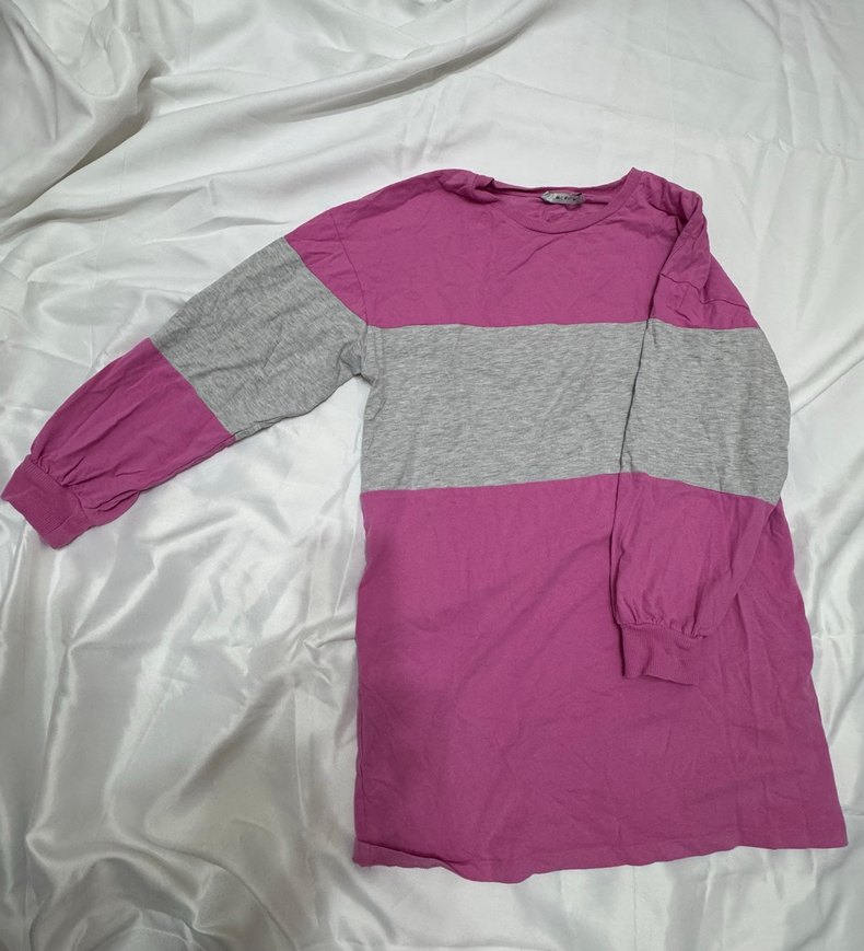 Kadın sweatshirt, uzun kollu ve yuvarlak yakalıdır. Pembe ve gri renk bloklu, sentetik kumaştan yapılmıştır ve rahat, trend bir stil sunar.